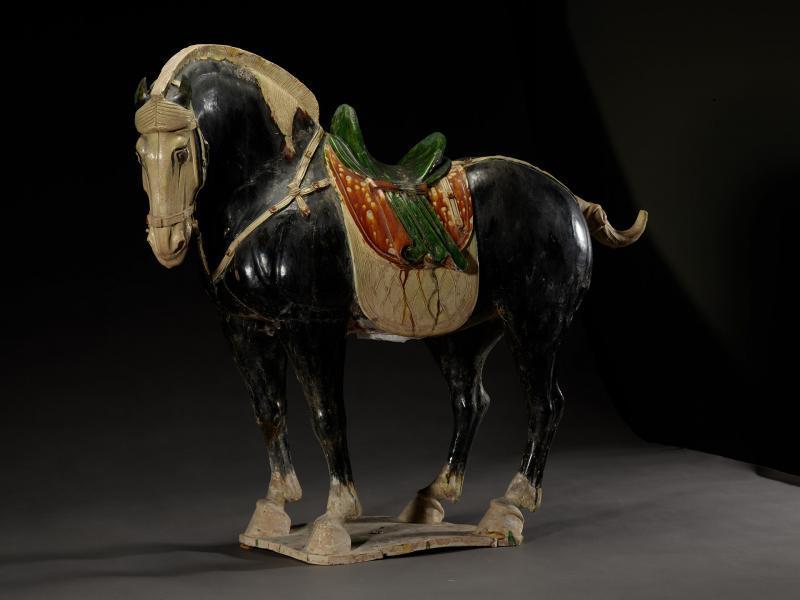 展品中,一件出土于河南洛阳关林的唐代三彩黑釉陶马尤为引人注目。此陶马一改秦汉时期平稳古拙的风格,展现出高昂彪悍的生动姿态。唐墓中出土的各种三彩马,尽管千姿百态,却都具有头小、臀圆、体态匀称、膘肥体壮的特点,是当时西域马体型的写照。这件马俑除面、鬃、尾、蹄涂白釉外,全身披黑釉,在唐三彩中实属罕见,而且造型雄健,釉色匀称,姿态自然,是唐三彩马中不可多得的精品。