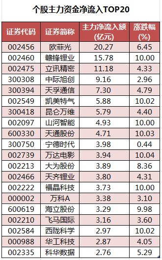 个股来看,今日有2012只个股获主力资金净流入,其中,77股获主力资金净流入超1亿元。欧菲光主力资金净流入最多,净流入金额为20.27亿元;主力资金净流入居前的个股还有赣锋锂业、立讯精密、中际旭创、天孚通信、凯美特气等,净流入金额分别为15.78亿元、11.18亿元、9.16亿元、7.3亿元、5.88亿元。