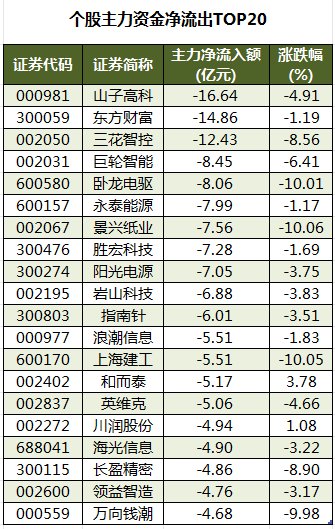 今日有3135只个股被主力资金净卖出,其中,169股被主力资金净卖出超1亿元。主力资金净流出最多的个股是山子高科,净流出金额为16.64亿元;主力资金净流出居前的个股还有东方财富、三花智控、巨轮智能、卧龙电驱、永泰能源等,净流出金额分别为14.86亿元、12.43亿元、8.45亿元、8.06亿元、7.99亿元。