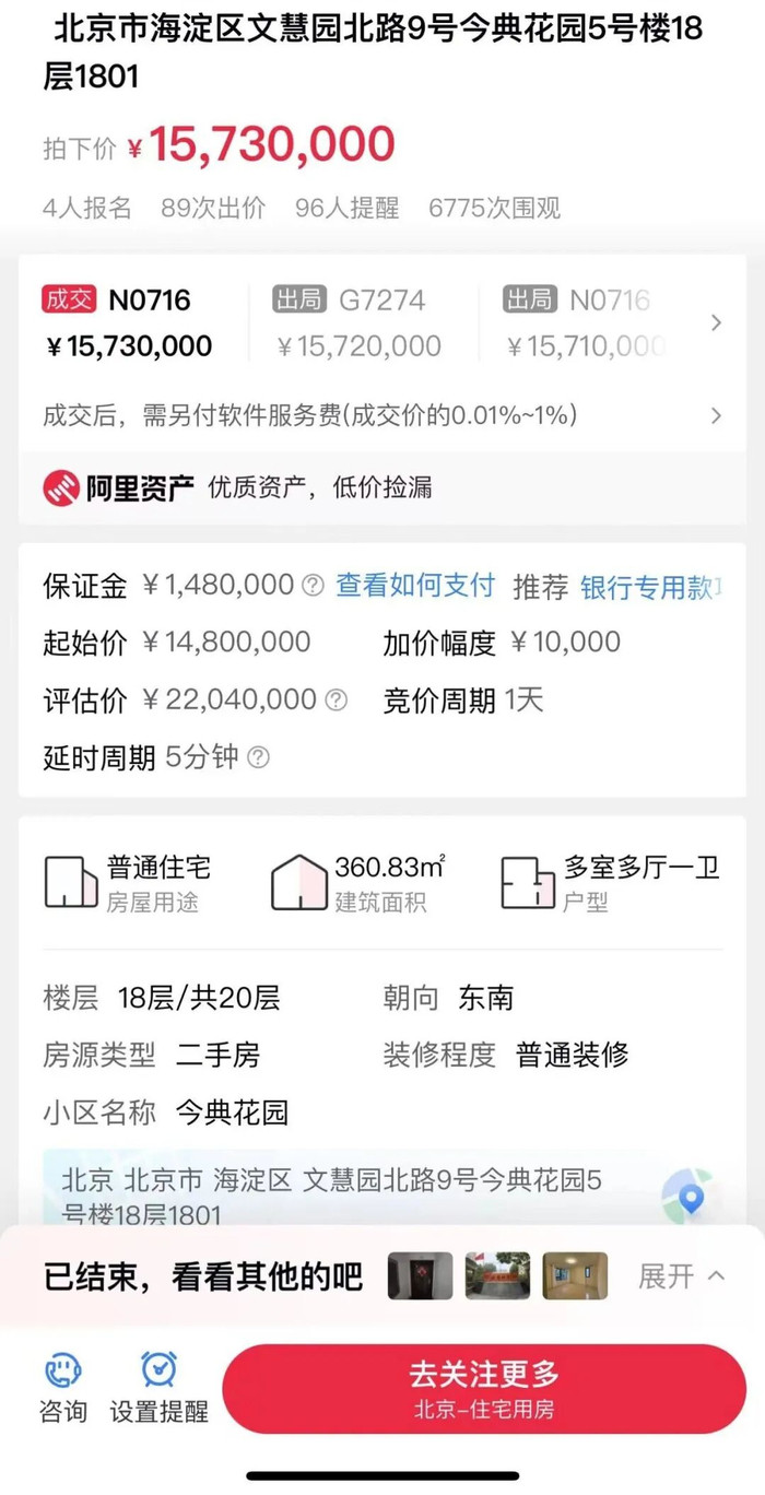 记者在阿里资产平台看到,一处位于北京市海淀区文慧园北路9号的房产以1573万元成交,明显低于市场价。该房产出让方为南京银行股份有限公司,面积为360多平方米,共有4位竞拍者进行了89次出价,吸引了6700余人围观。