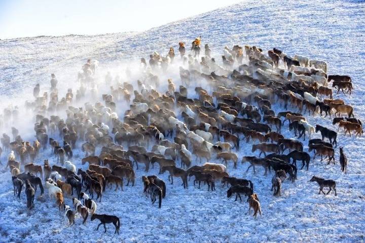 2026年2月9日拍摄的锡林郭勒草原冬季万马奔腾场景。受访者供图新春年景,马都的春天
